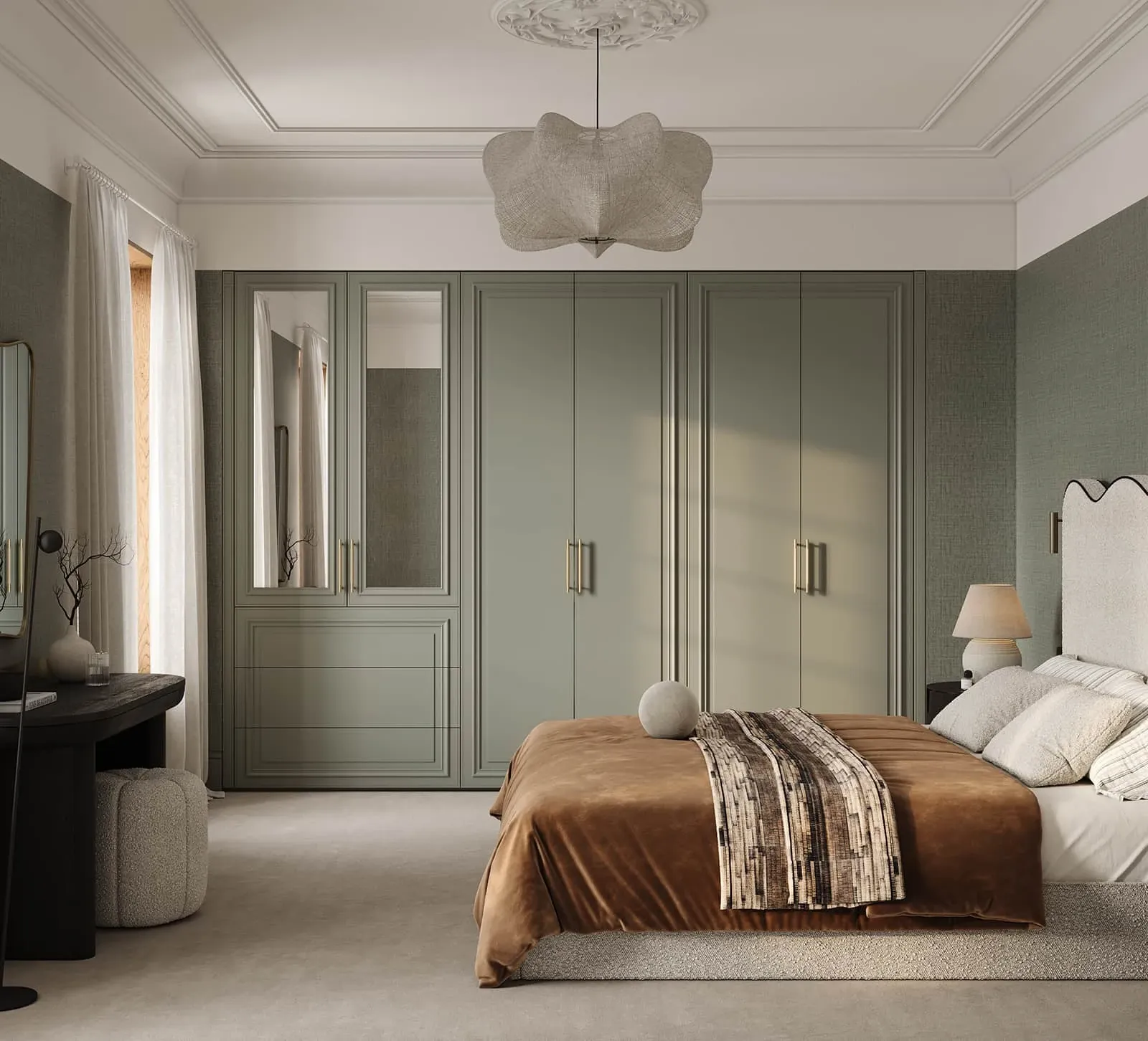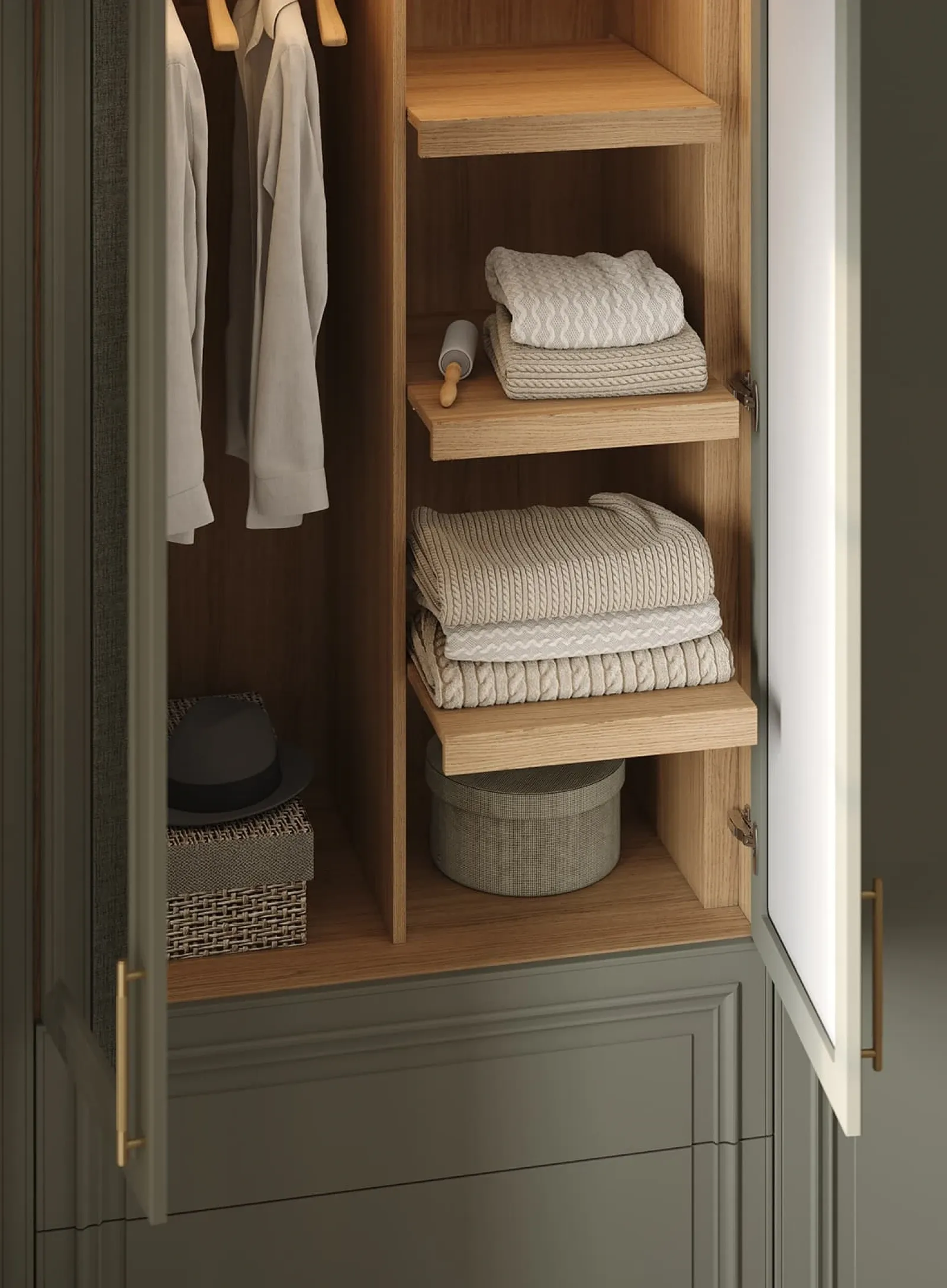 КАРКАС, ПОЛКИ, ВЫДВИЖНЫЕ ЯЩИКИ, ЗАДНЯЯ СТЕНКА ЛДСП, декор Дуб Медовый / крашеная МДФ, цвет NCS S 3005-G20Y Матовый ФАСАДЫ Т654 Крашеная МДФ, цвет NCS S 3005- G20Y Матовый