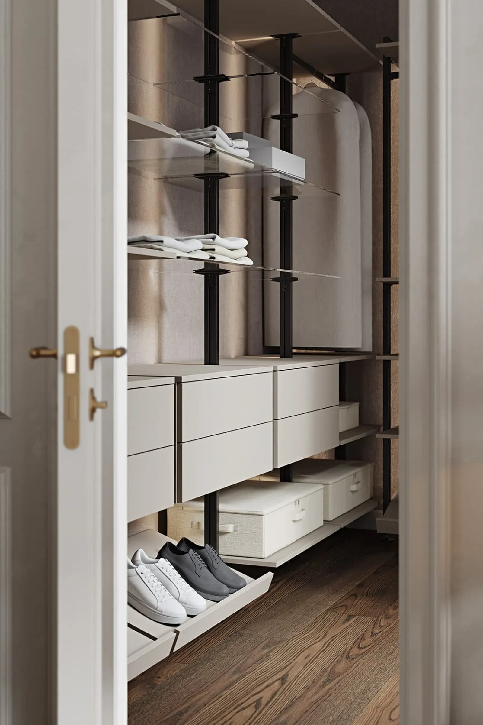 ОПОРНЫЙ ПРОФИЛЬ PA 02, цвет Черный Матовый НАВЕСНЫЕ ЭЛЕМЕНТЫ ЛДСП (толщина 18 мм), цвет Ярко-серый / стекло прозрачное (толщина 6 мм)