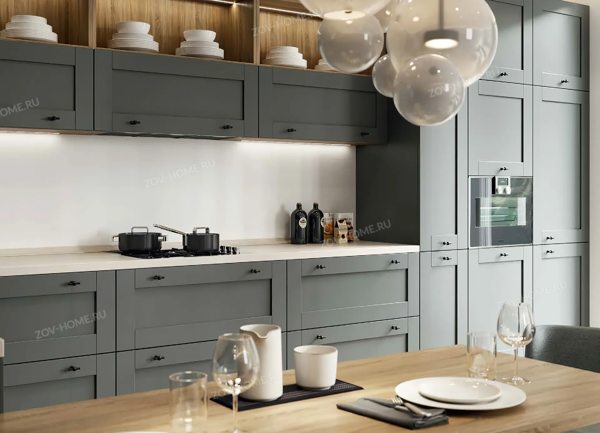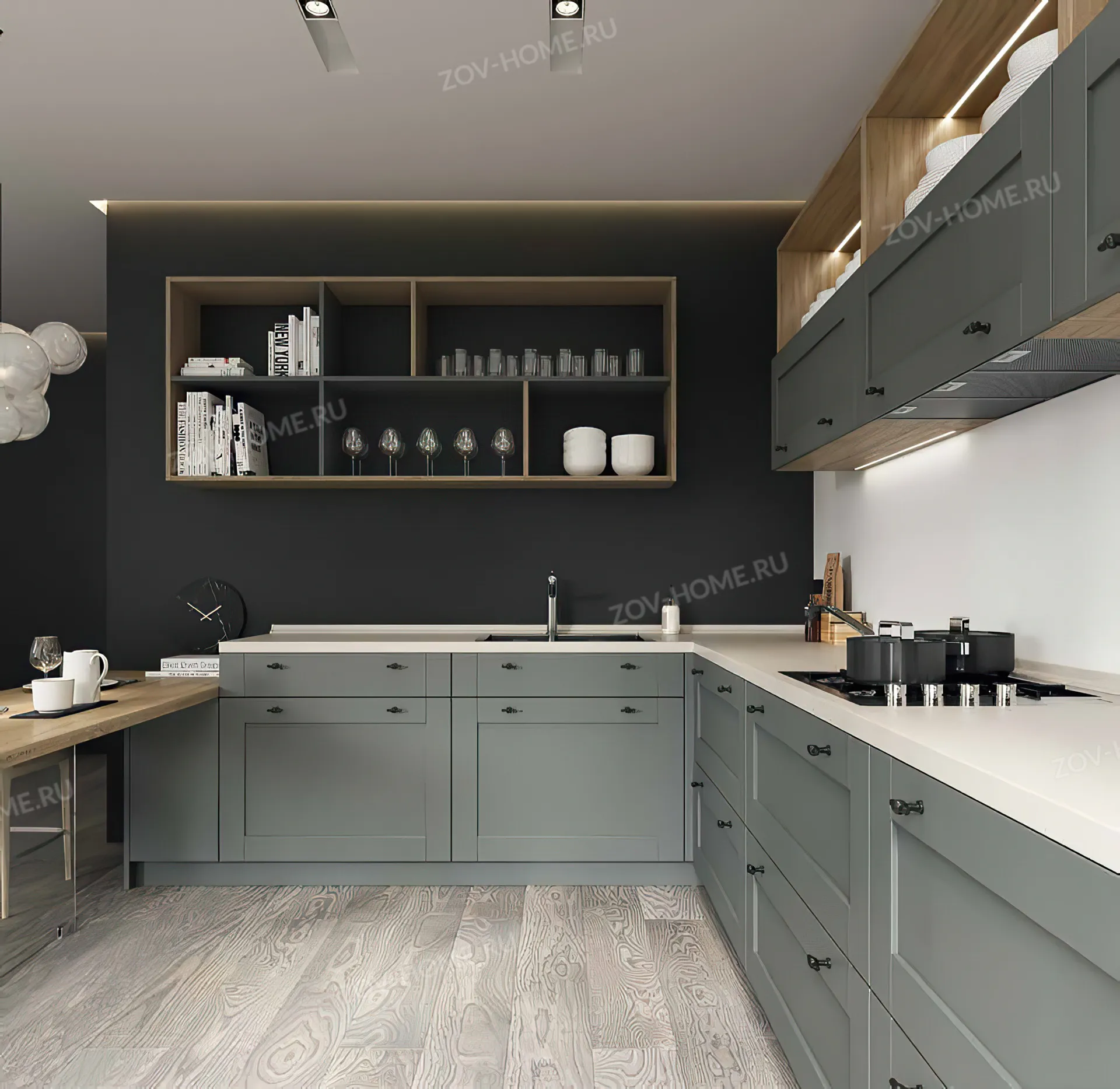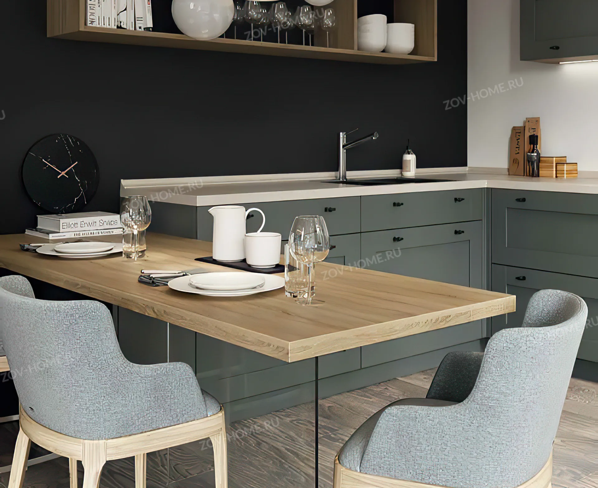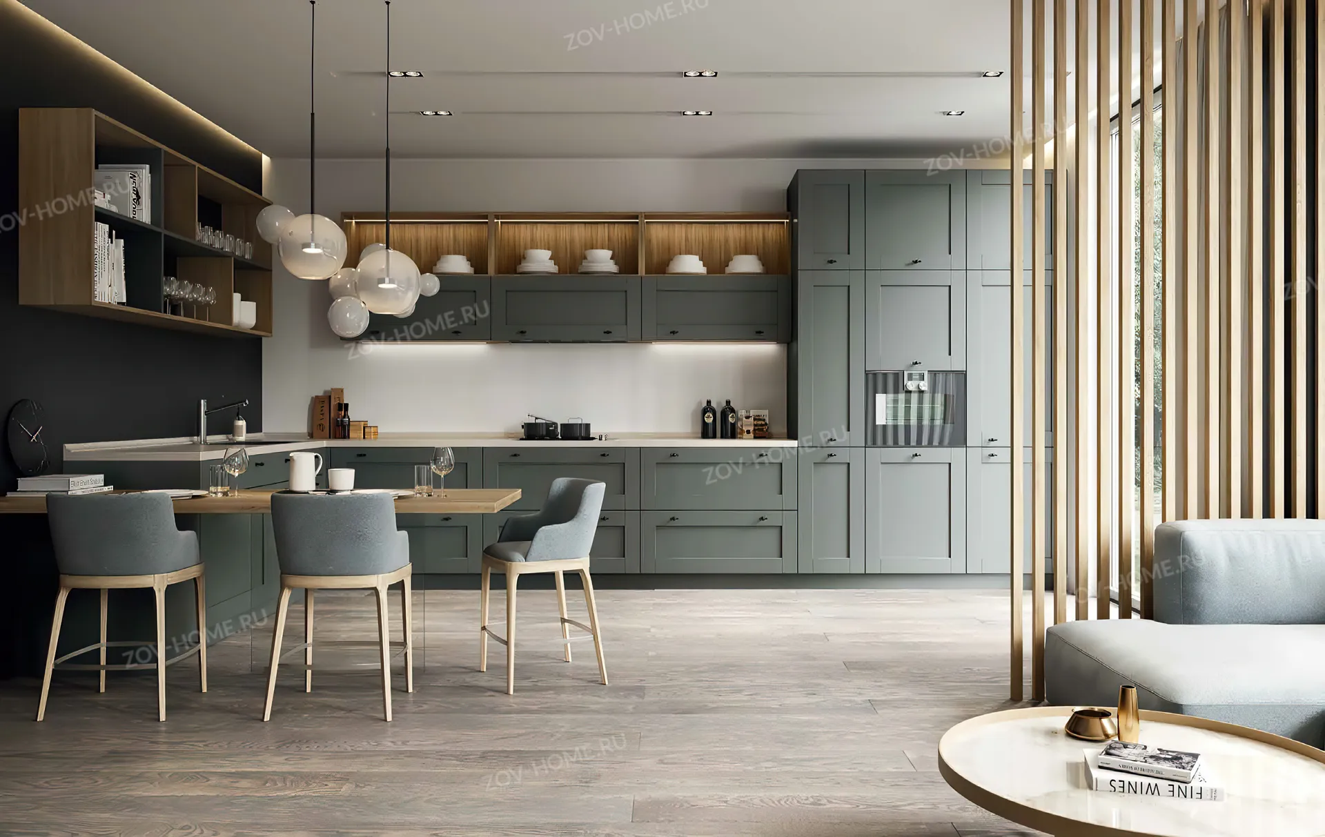 Полки: Открытые, 18мм Тимбер Сабия / 19мм, крашеная МДФ, цвет NCS S 6005-G50Y, Матовый