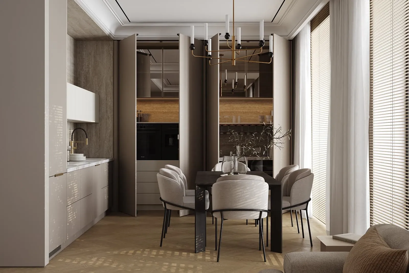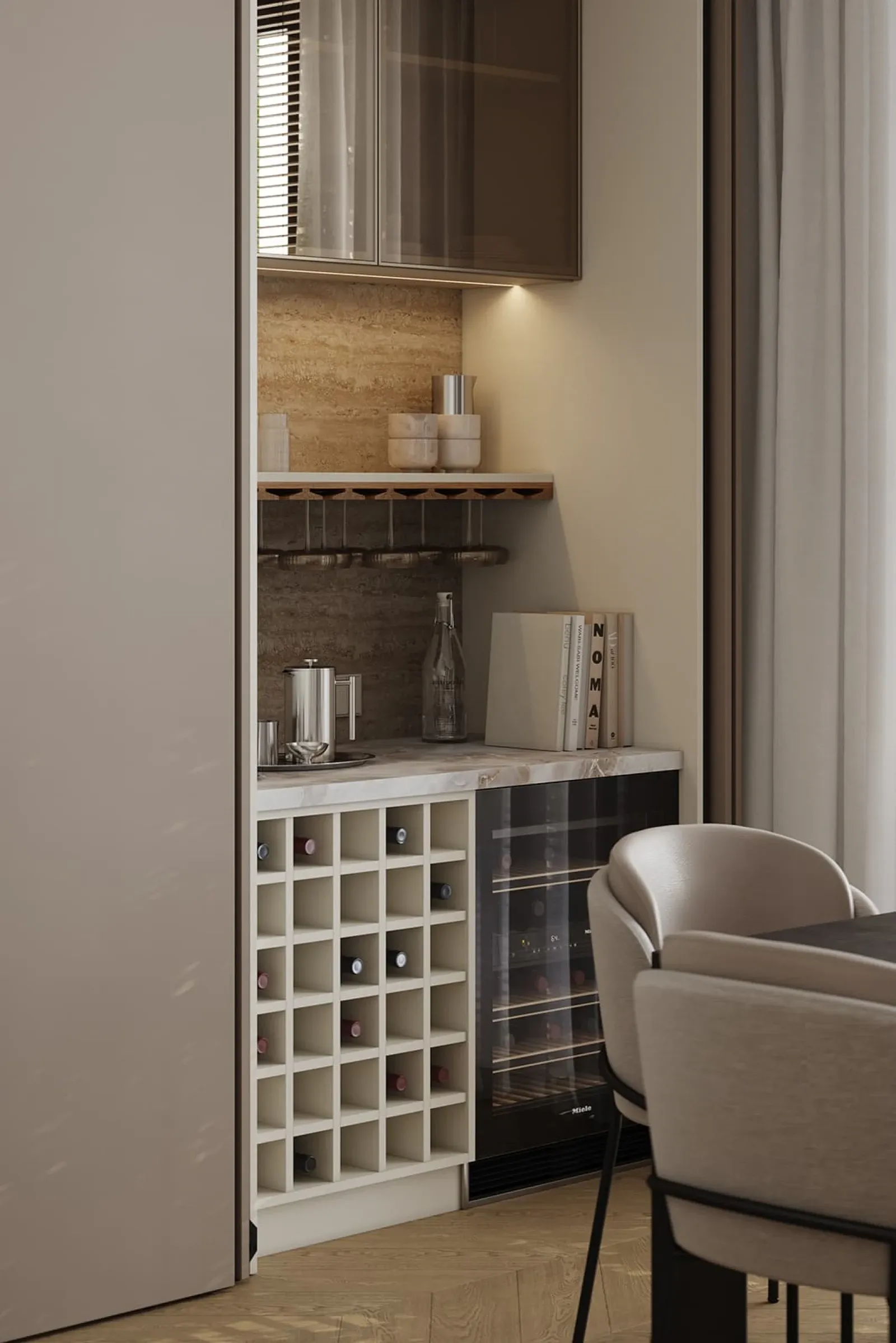 Витрины: Алюминиевый профиль А-6 Латунь (скрытая петля AIR PUSH), стекло Феникс Бронза