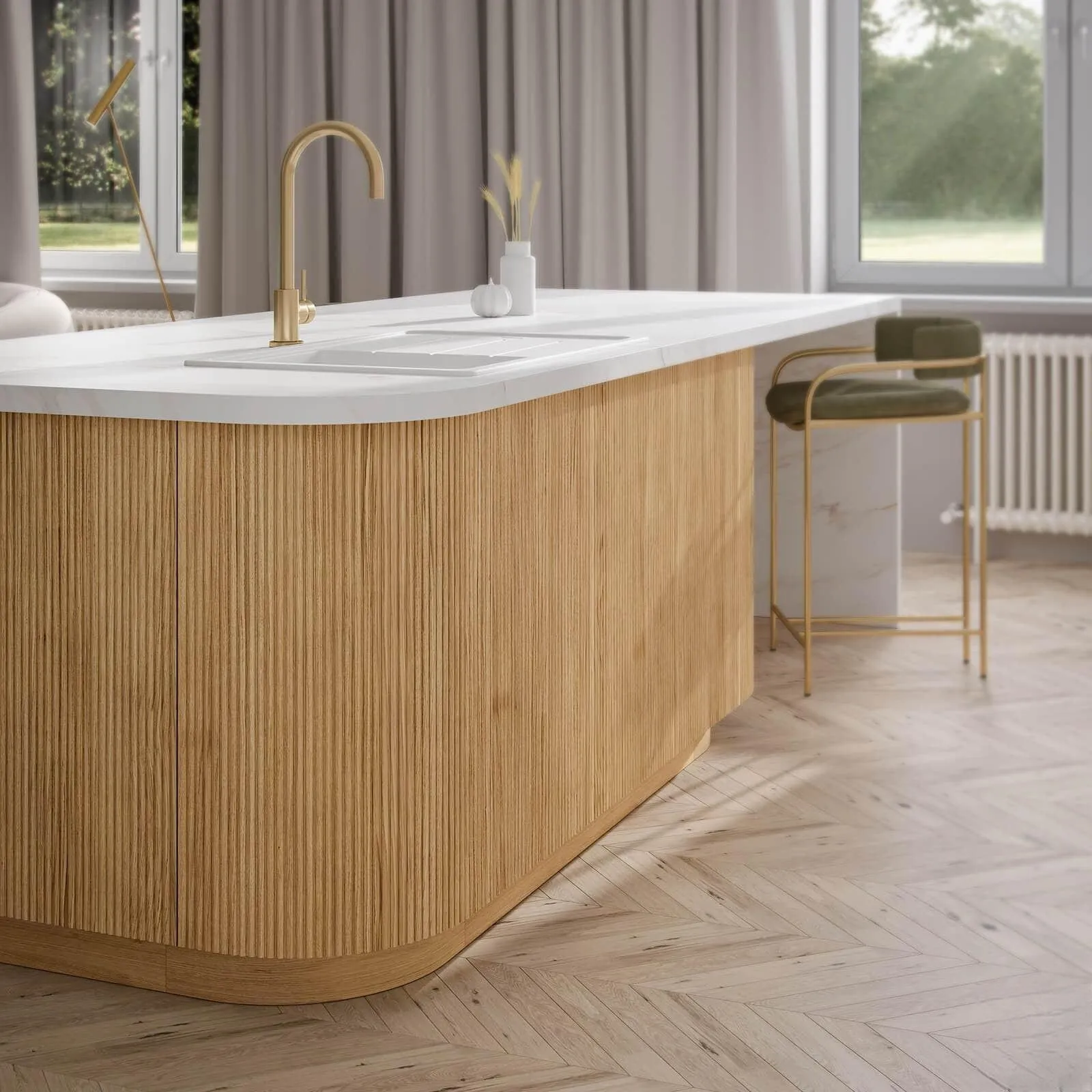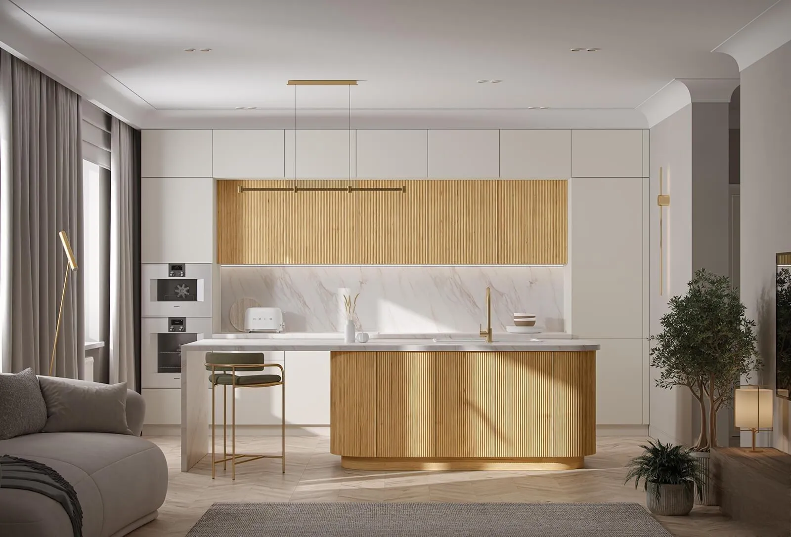 Фасады: T430 МДФ / массив дуба, цвет #154 Natur / пластик HPL, цвет Бьянко