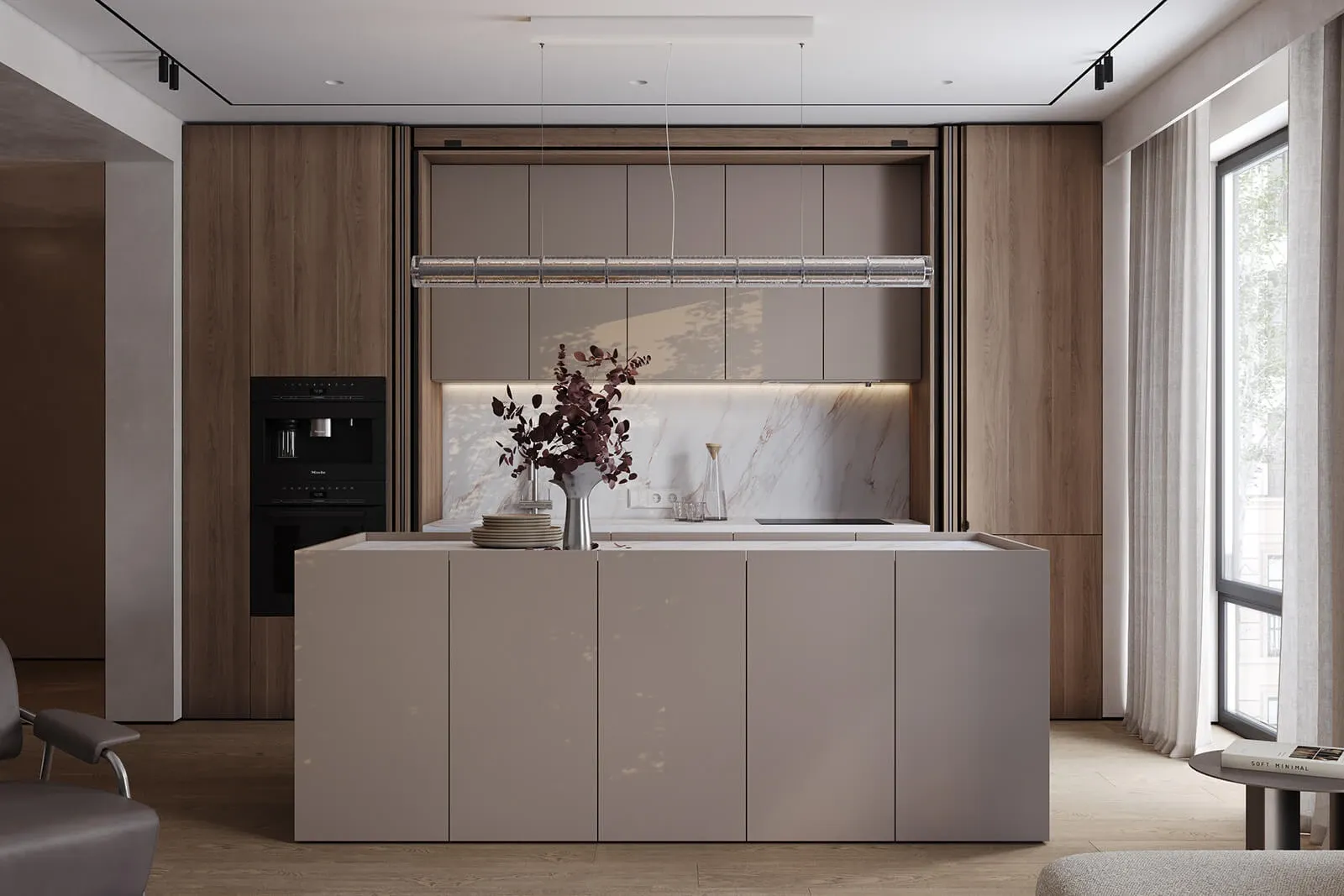 Фасады: ЛМДФ SUPRAMAT, цвет Сафари Супрамат / ЛМДФ Тимбер, декор Кунео Коричневый / Т651 Крашеная МДФ, цвет NCS S 6020-R Матовый