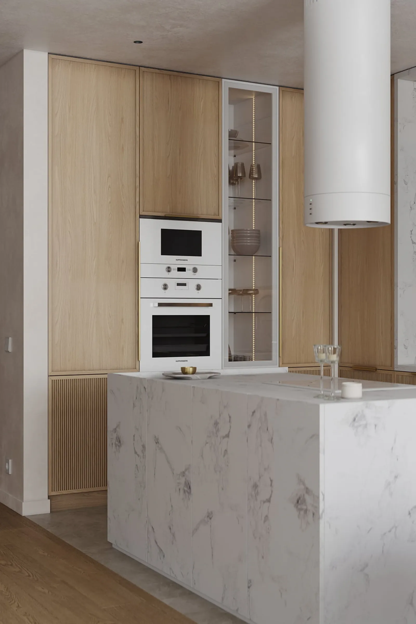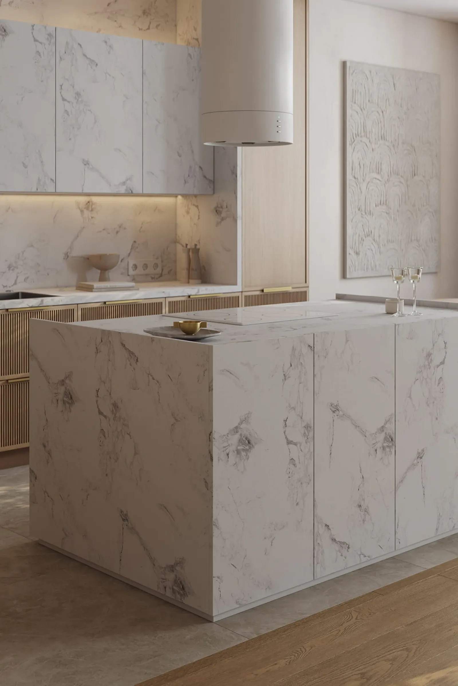 Фасады: Т431В / Т441 Шпон дуба, цвет #183 (масловоск Бесцветный) / пластик HPL Möbius Soft Touch, декор Мрамор Бернини