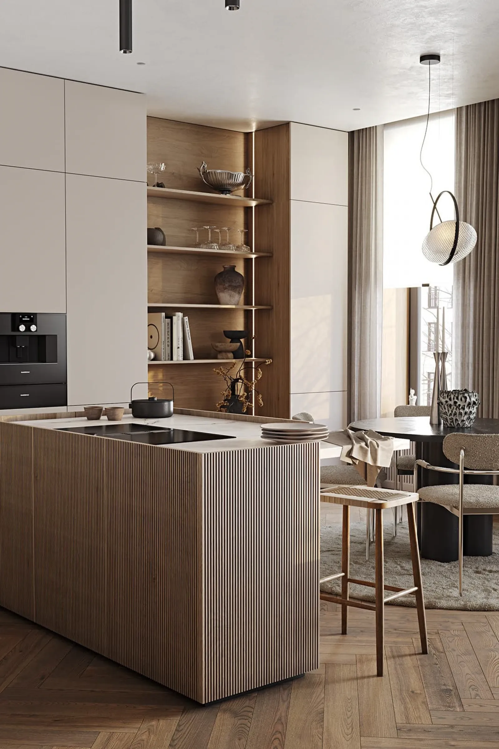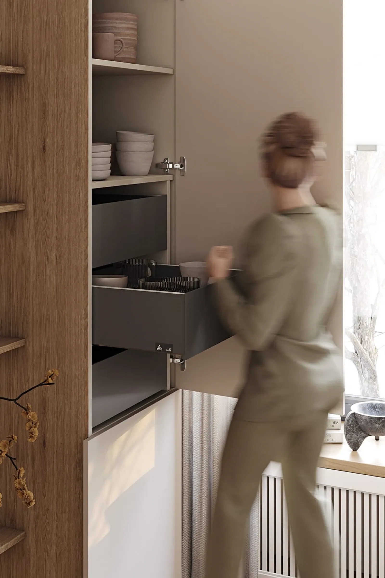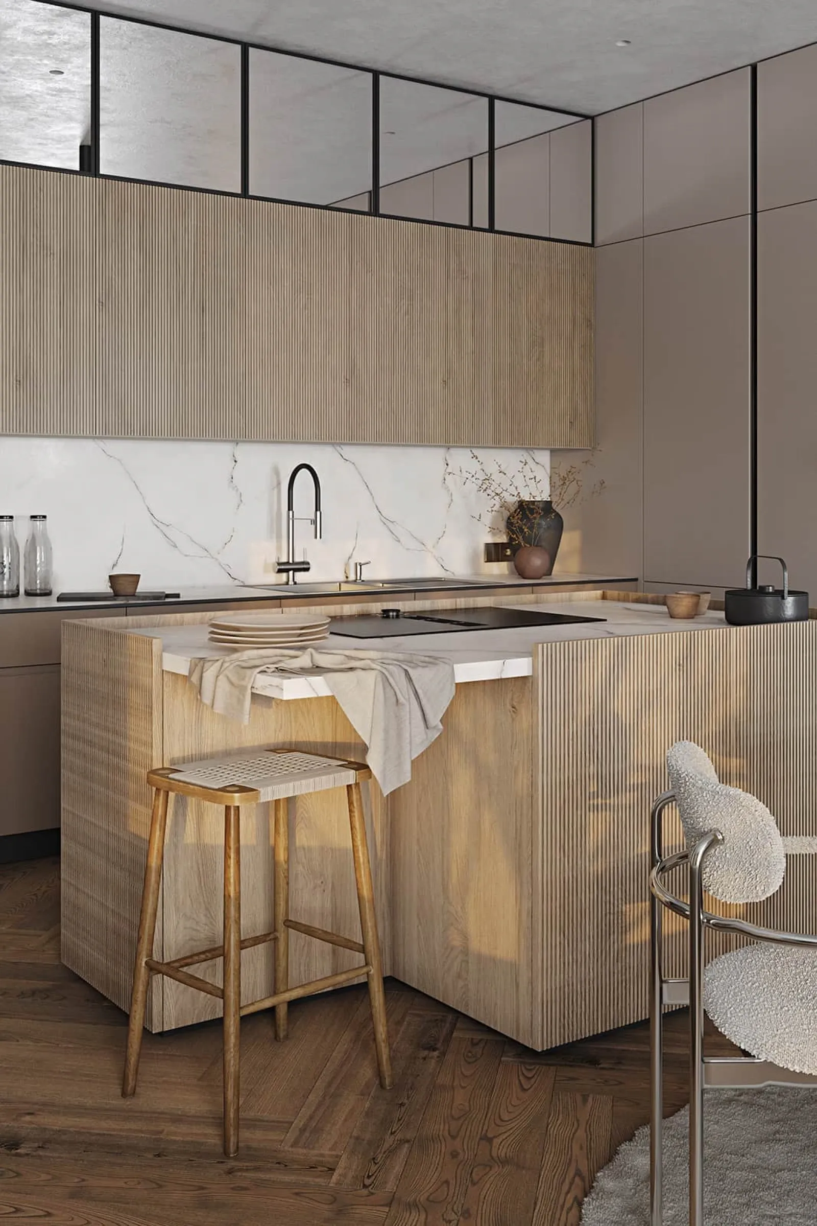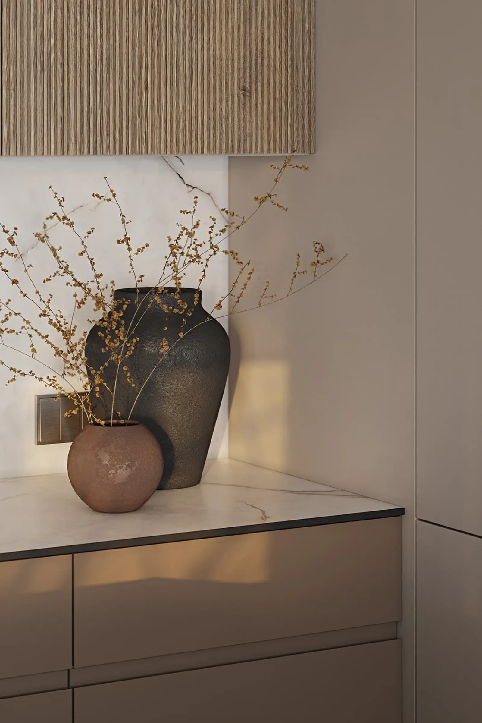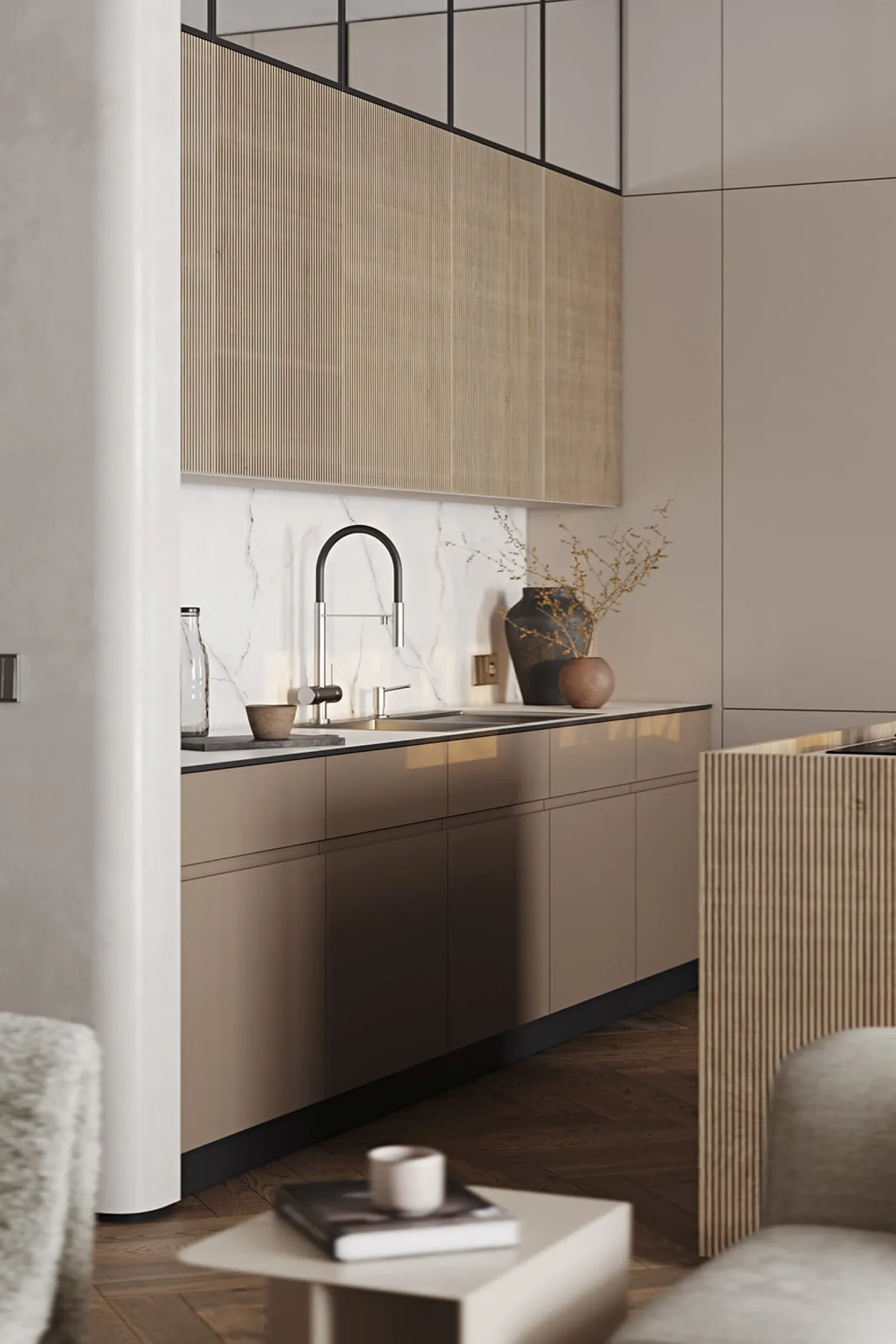 ФАСАДЫ Т440 Шпон дуба, цвет #189 (воскобейц Белый) / акрил FENIX NTM, цвет Серо-бежевый NTM (0748) / крашеная МДФ, цвет NCS S 5010-Y50R Матовый СТОЛЕШНИЦА Компакт-плита, 12 мм, декор Миони / пластик HPL, 38 мм, декор Миони