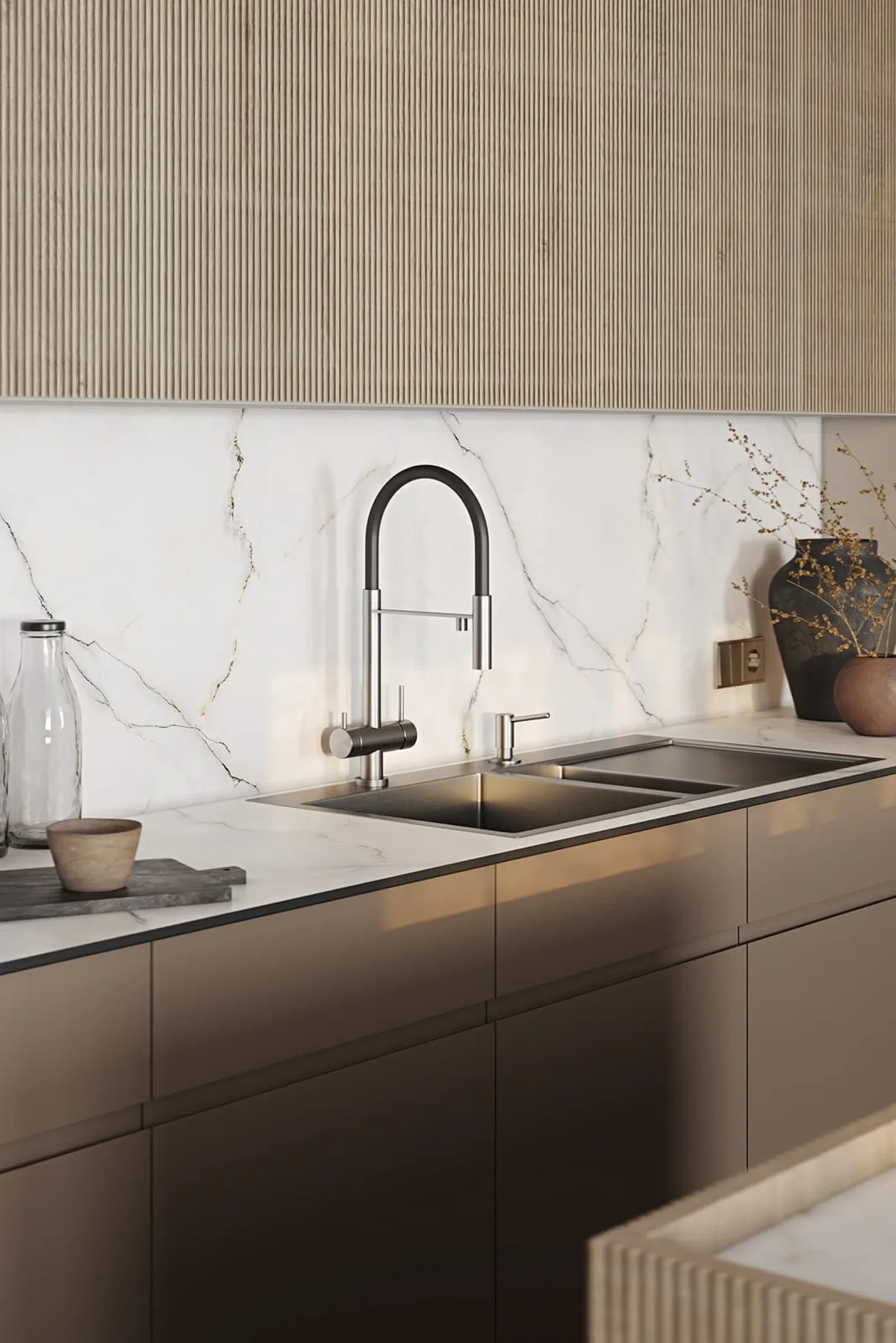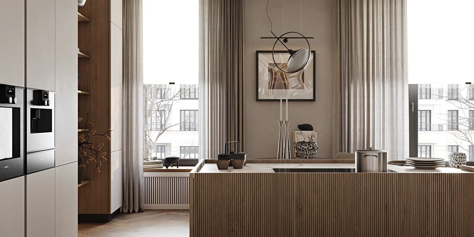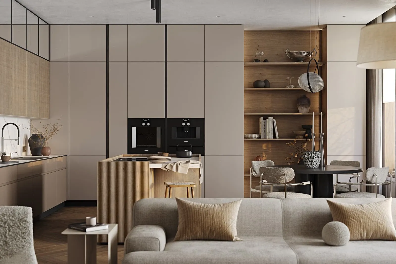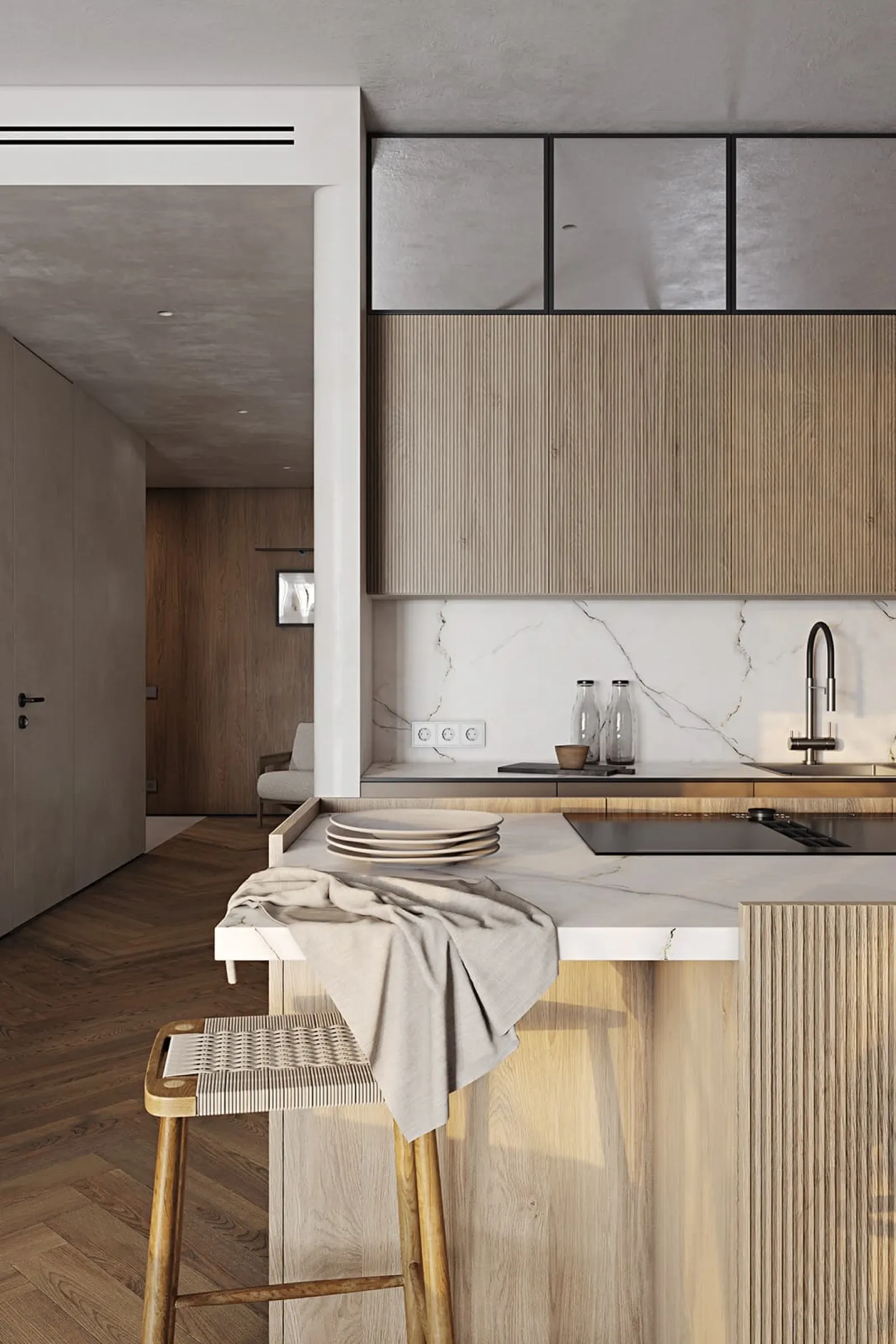 ФАСАДЫ Т440 Шпон дуба, цвет #189 (воскобейц Белый) / акрил FENIX NTM, цвет Серо-бежевый NTM (0748) / крашеная МДФ, цвет NCS S 5010-Y50R Матовый СТОЛЕШНИЦА Компакт-плита, 12 мм, декор Миони / пластик HPL, 38 мм, декор Миони