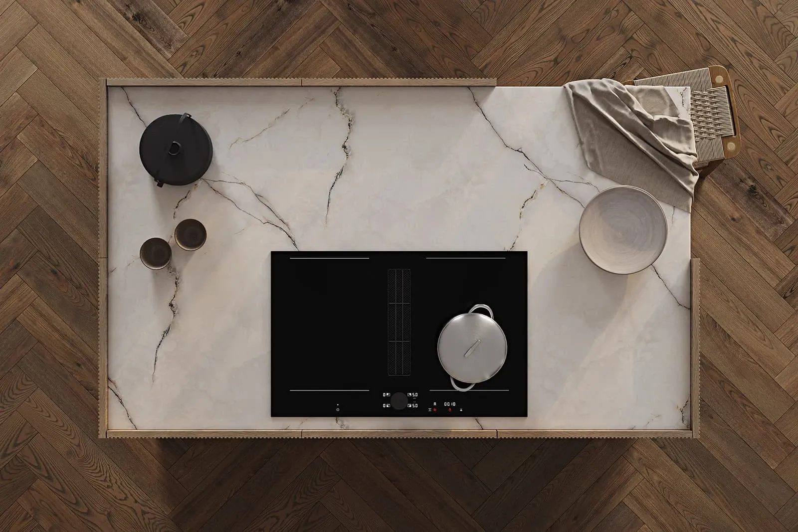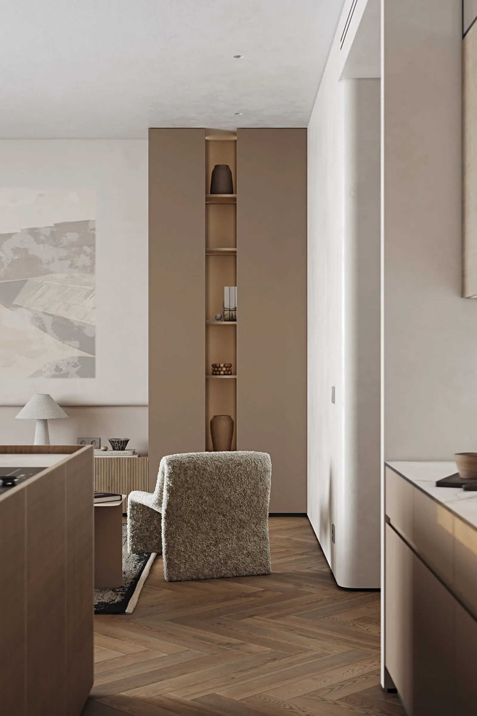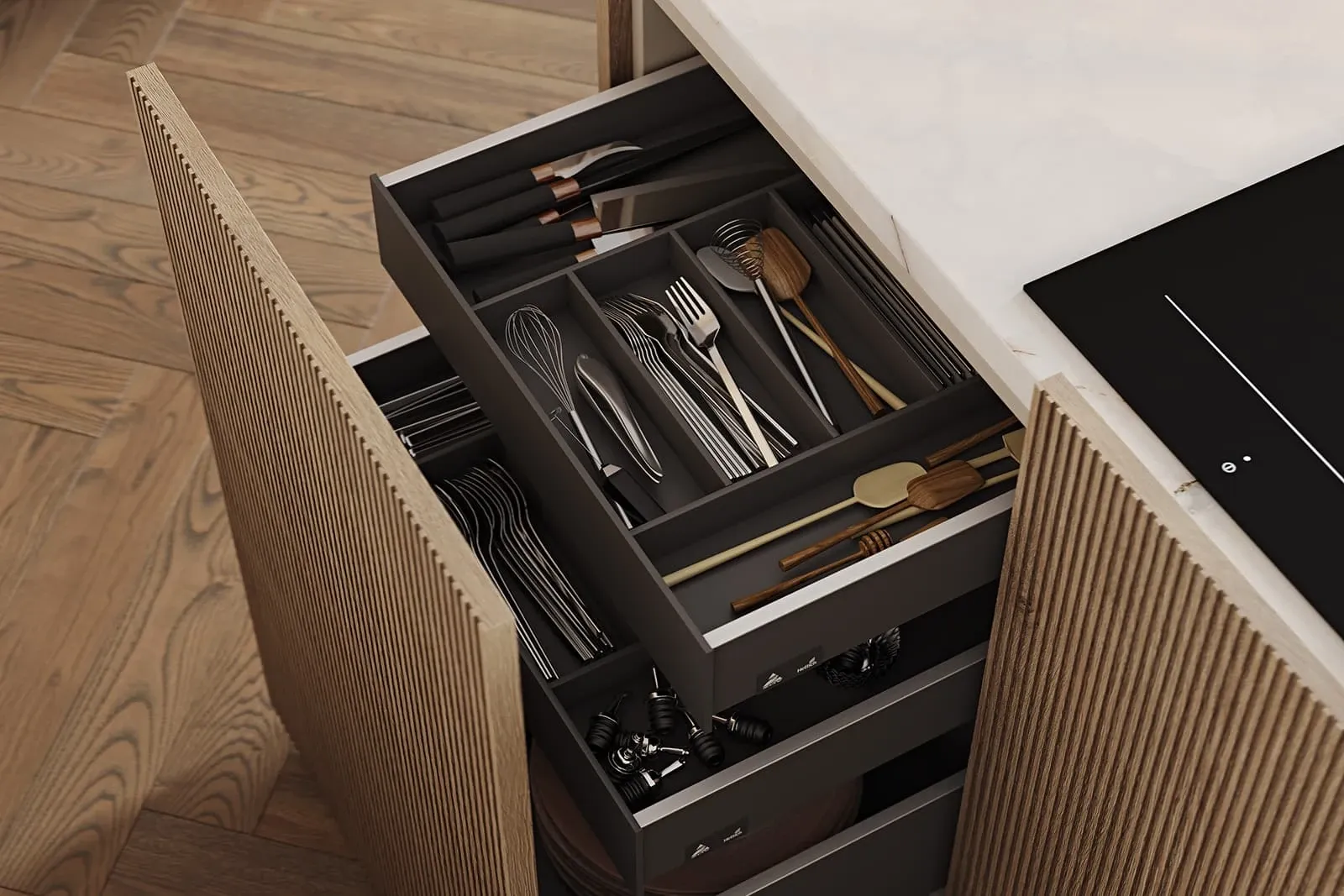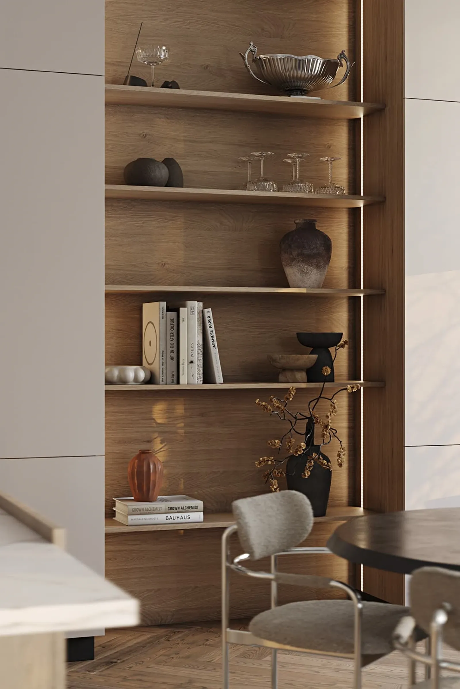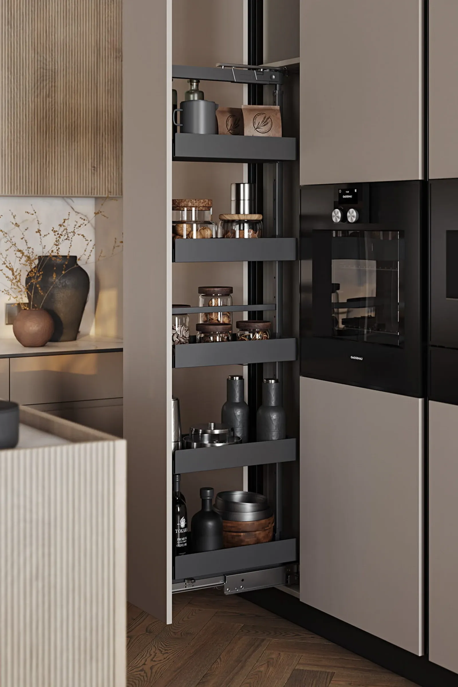 ФАСАДЫ Т440 Шпон дуба, цвет #189 (воскобейц Белый) / акрил FENIX NTM, цвет Серо-бежевый NTM (0748) / крашеная МДФ, цвет NCS S 5010-Y50R Матовый СТОЛЕШНИЦА Компакт-плита, 12 мм, декор Миони / пластик HPL, 38 мм, декор Миони