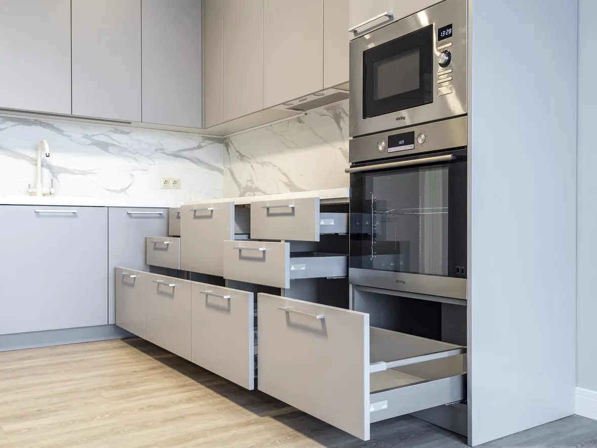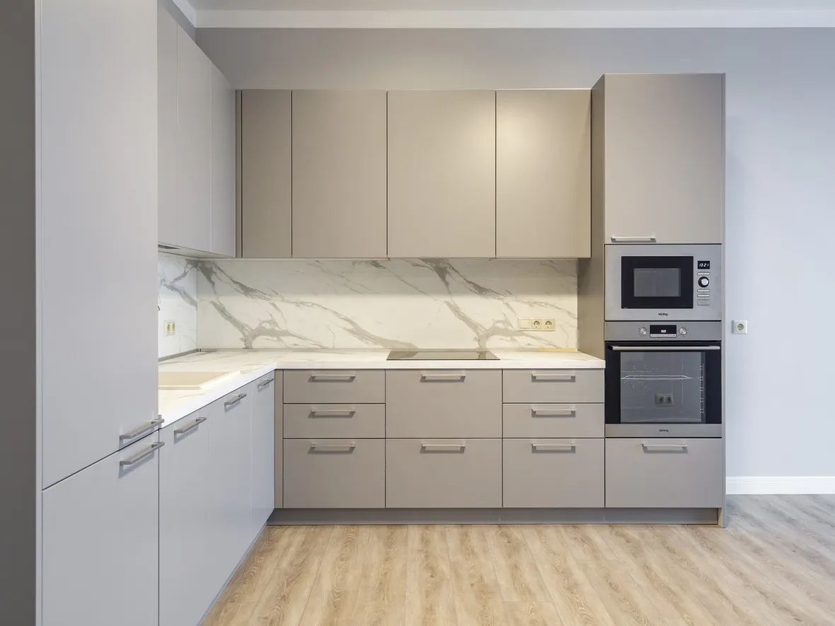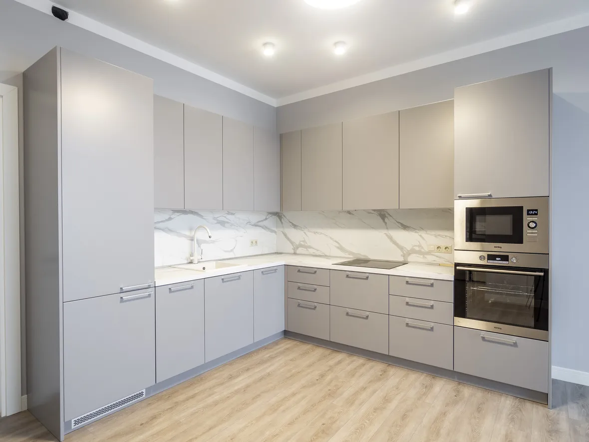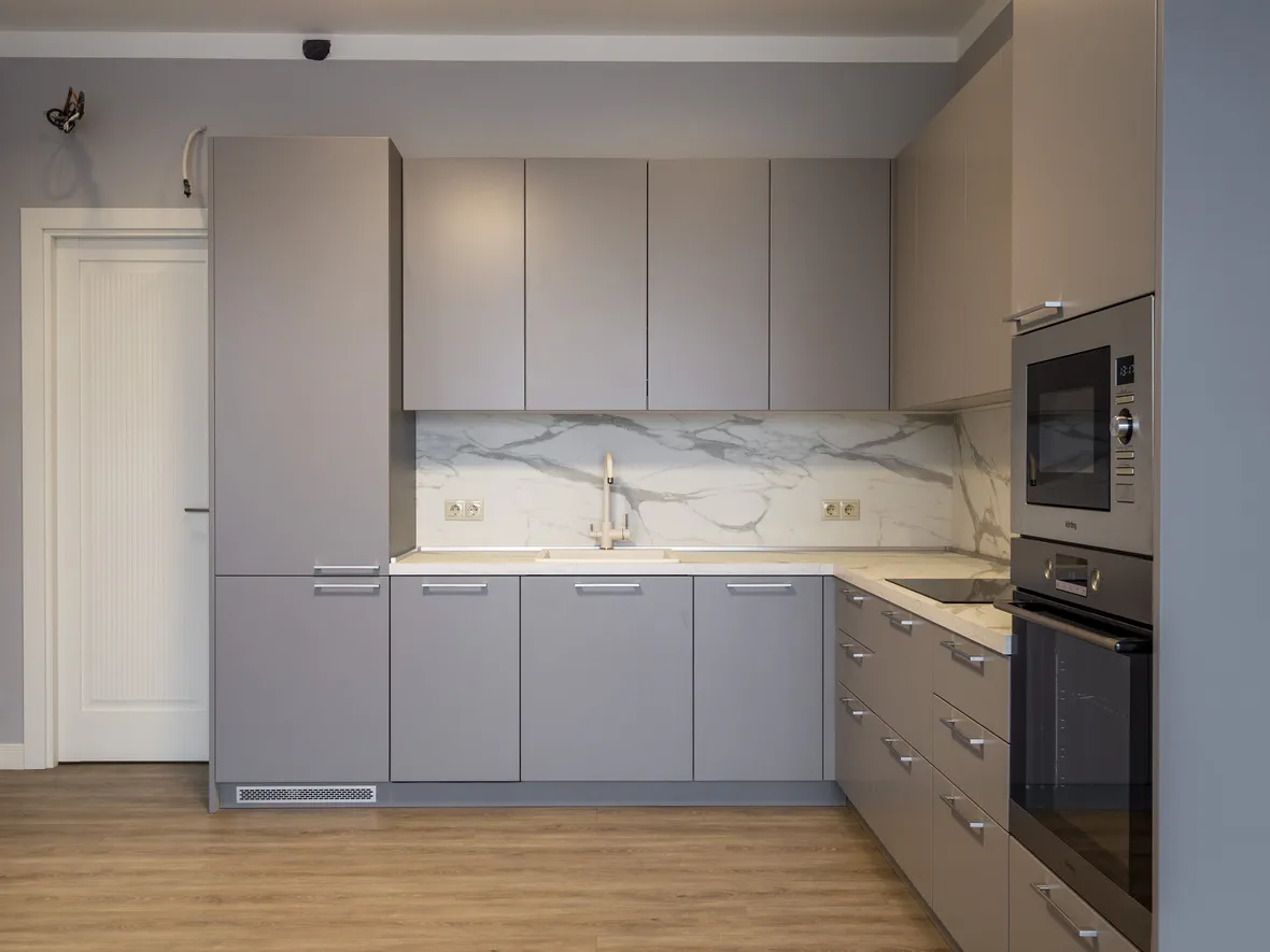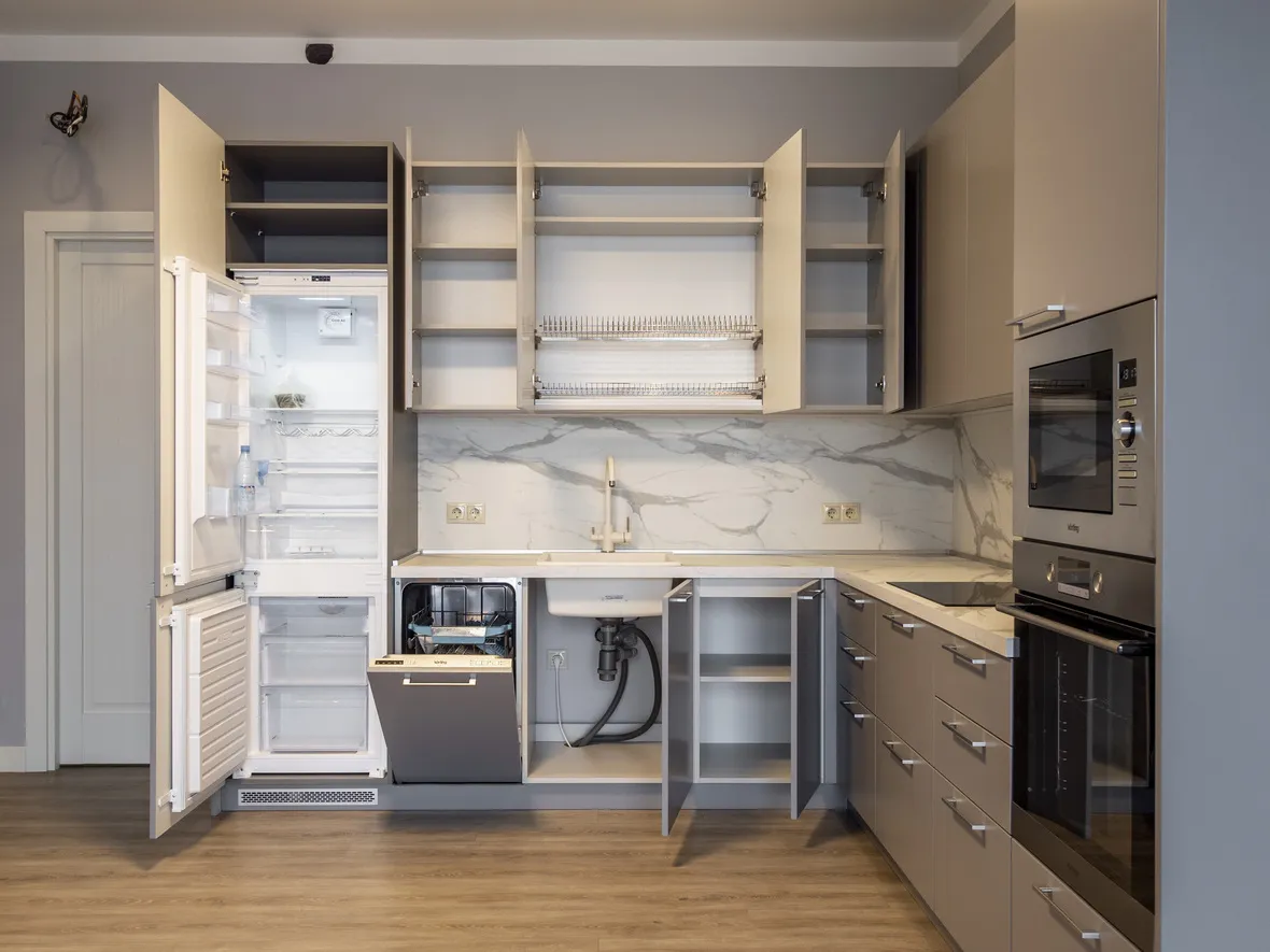 Техника: Встраиваемая вытяжка – MAUNFELD, электрический духовой шкаф, индукционная варочная панель, СВЧ, ПММ – KORTING, встраиваемый холодильник – HUNDAI, смеситель, мойка - EMAR