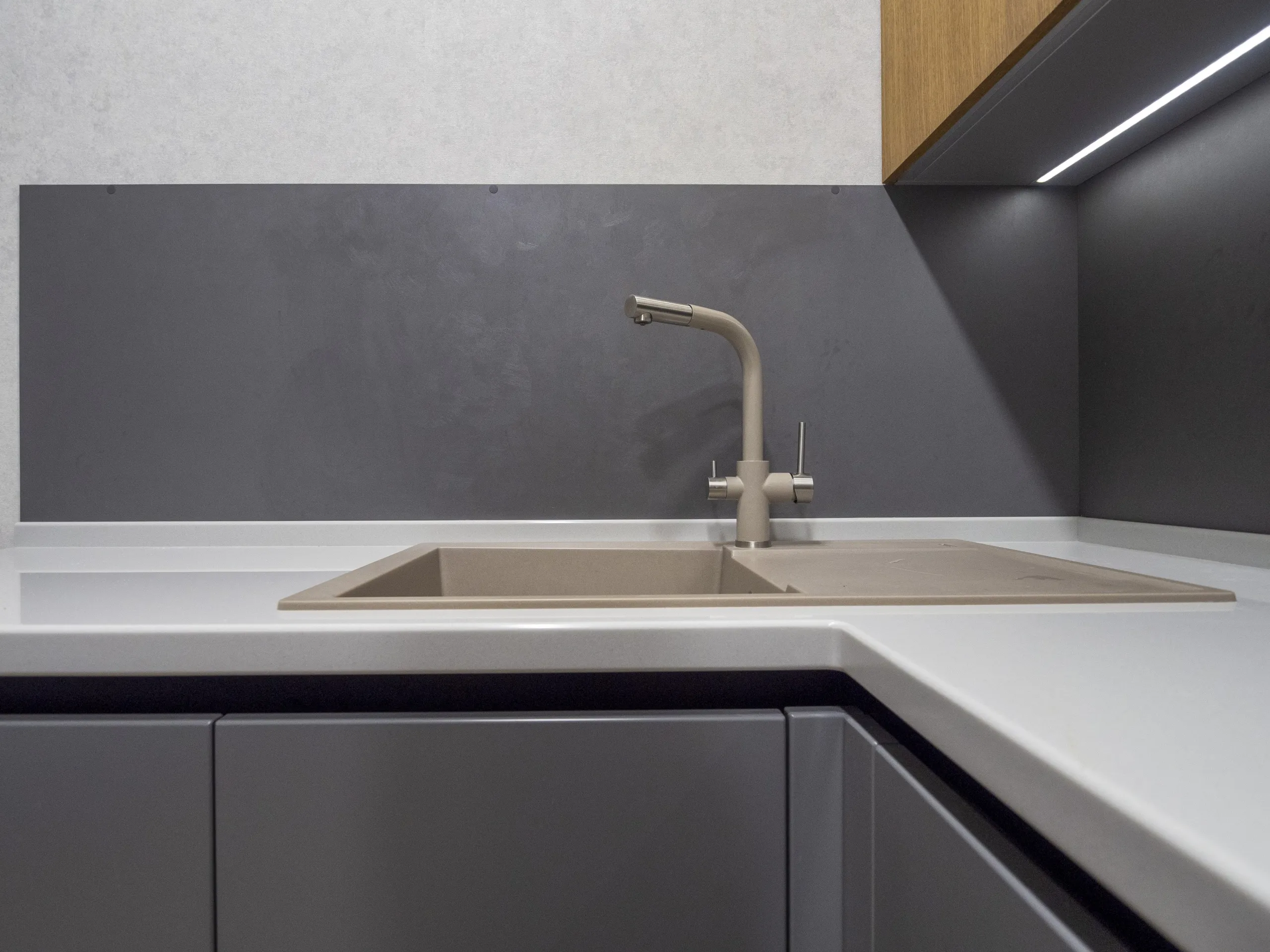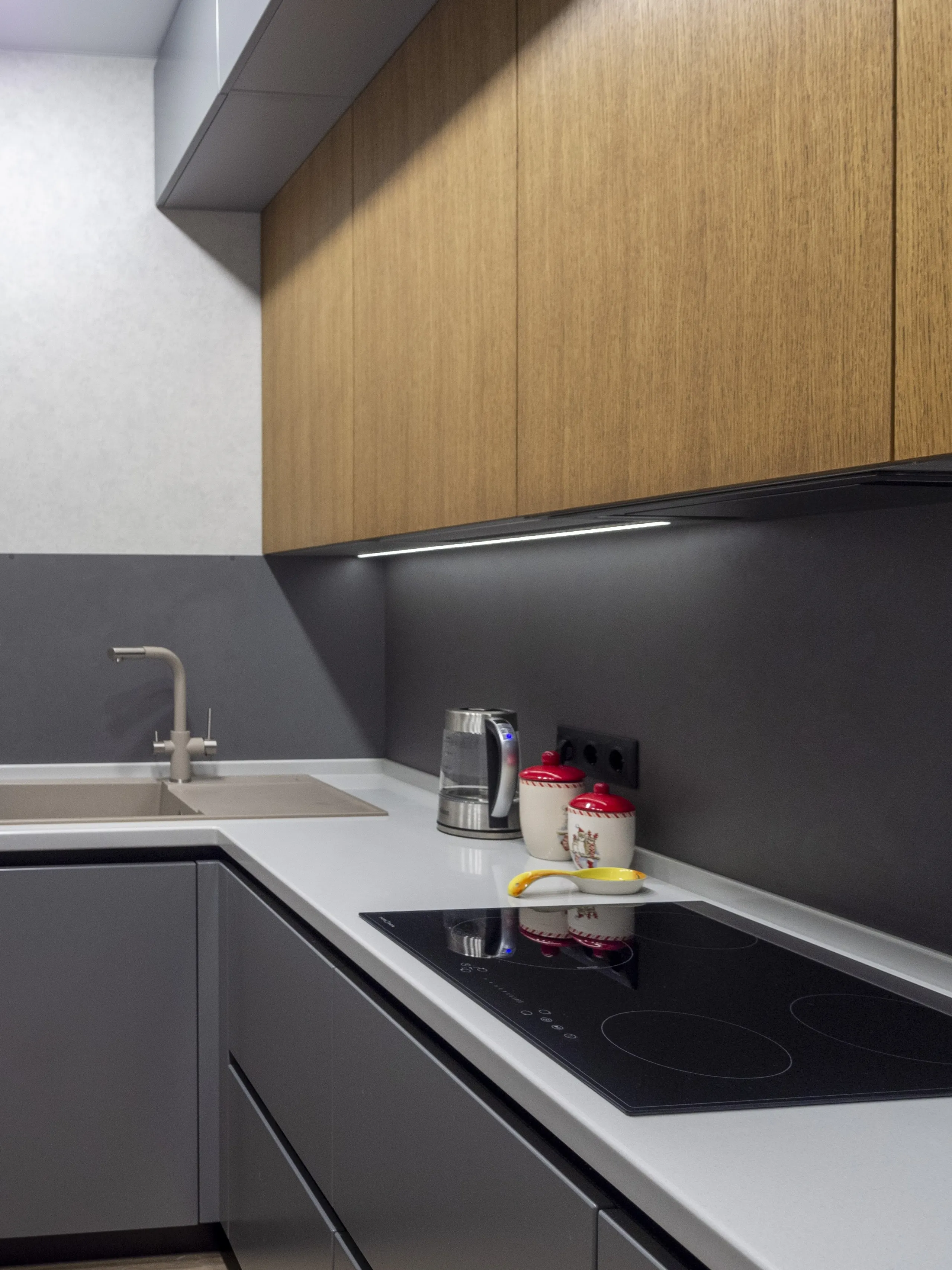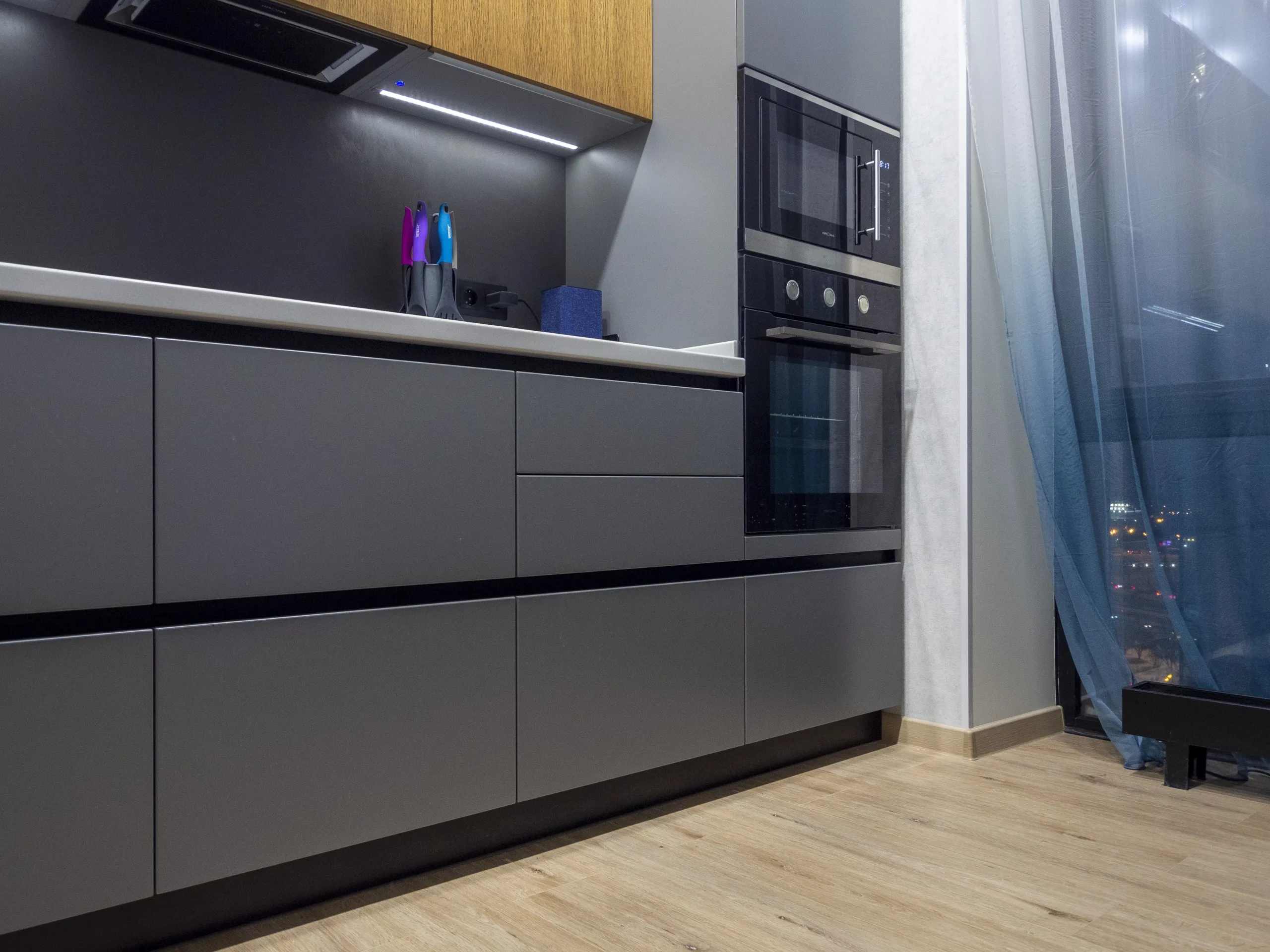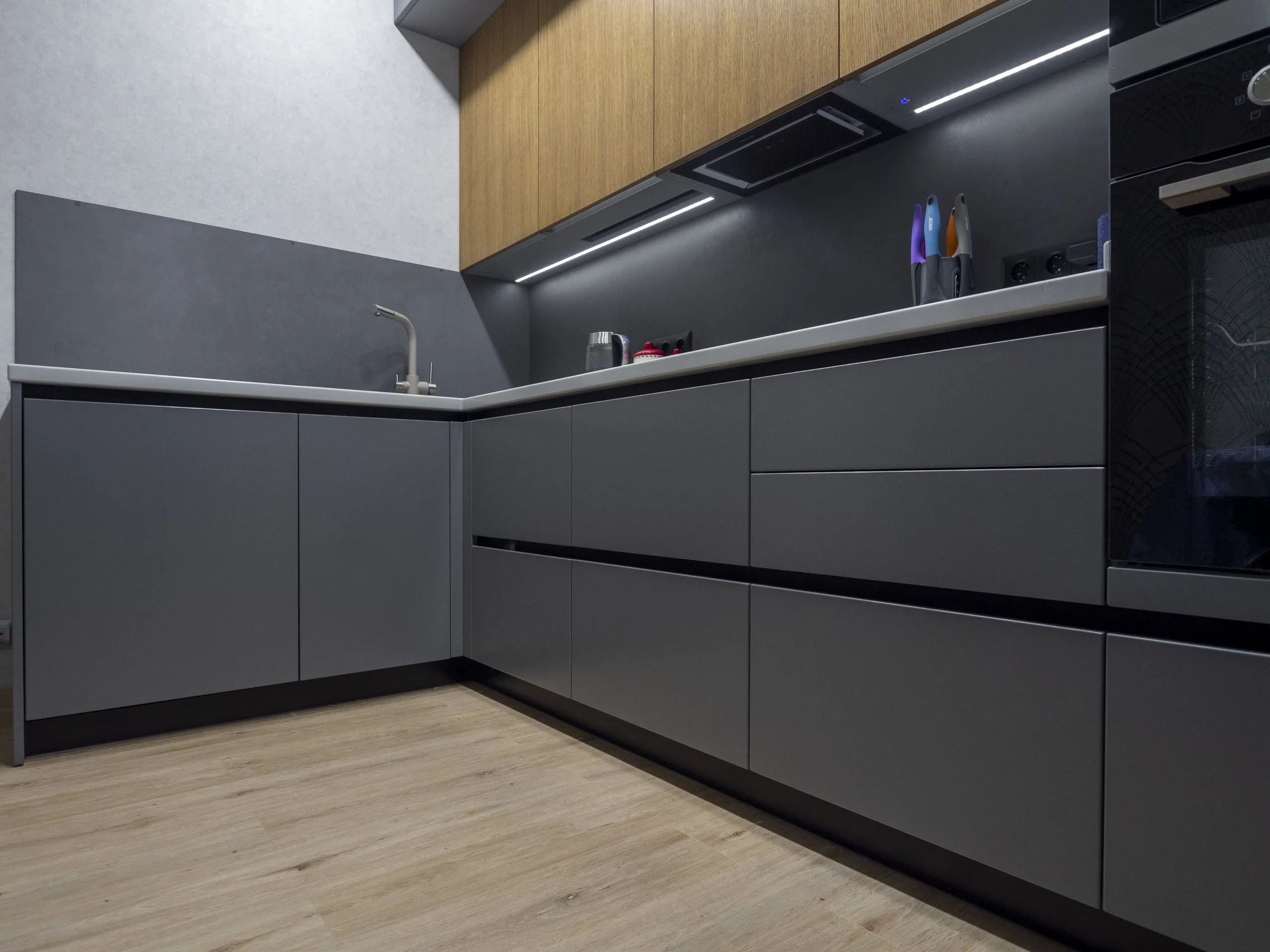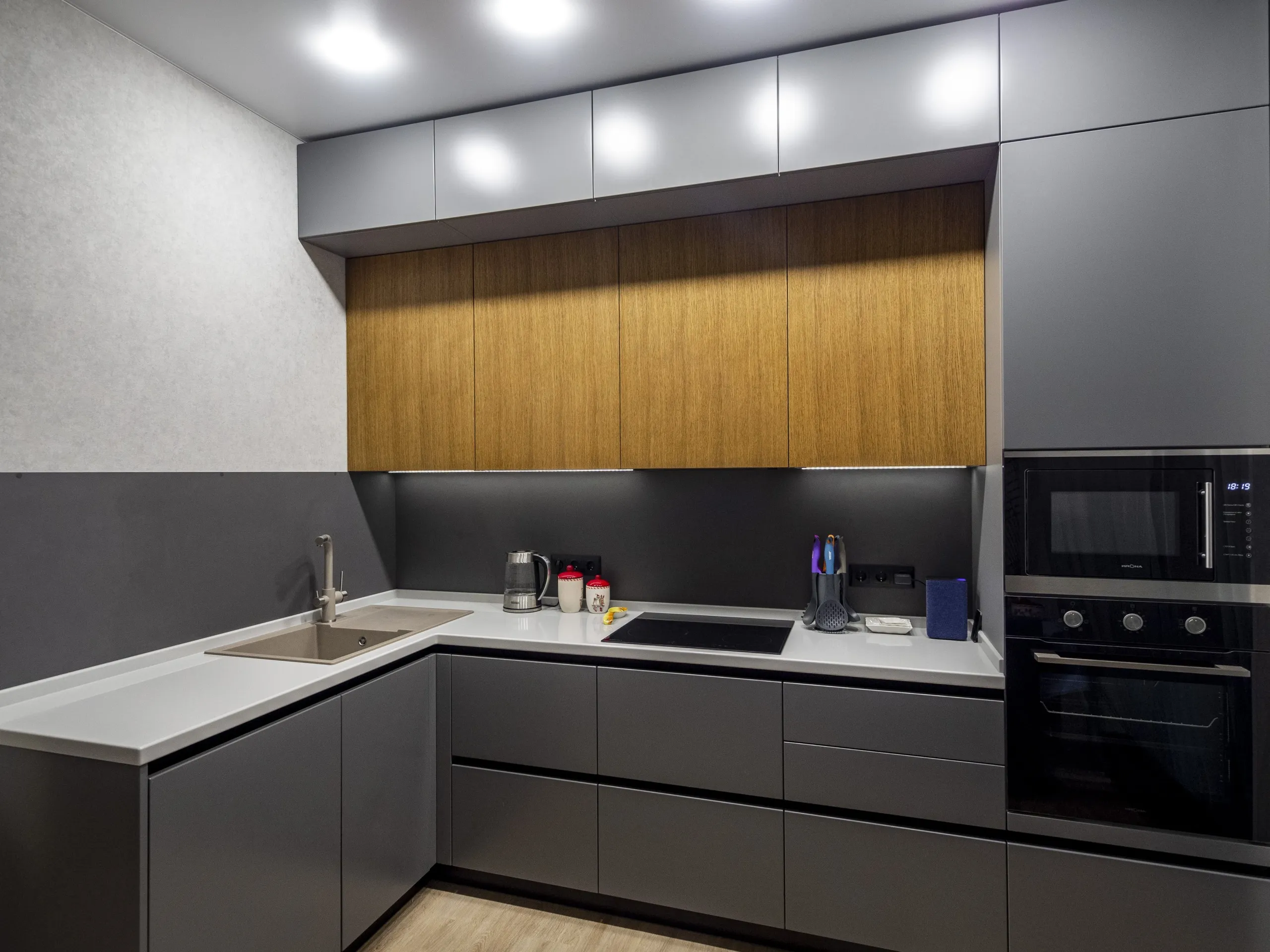 Фасады: Т419В/Дуб 182, Система/RAL 7037 мат, Alum A2/Терра черная.